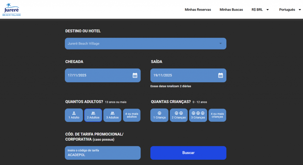 Com isso, o sistema exibirá automaticamente as páginas específicas com imagens das acomodações e os valores já ajustados com o desconto especial para os eventos.